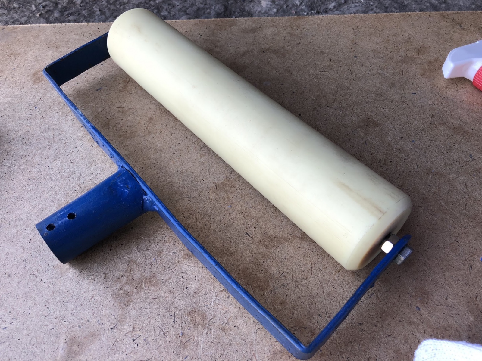 Валик укаточный шириной 300 мм — это вспомогательный инструмент для уплотнения резиновых покрытий после укладки. Сделан из полимерных материалов и нержавеющего металлического сплава.